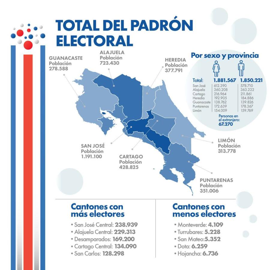Además, encontrarán datos desagregados de los ciudadanos empadronados en sitios de atención institucional (centros penitenciarios), hogares de larga estancia (hogares de ancianos), lugares para la atención de salud mental, zonas indígenas, nuevos electores (que podrán votar por primera vez), personas naturalizadas por lugar de nacimiento y voto en el extranjero. Finalmente se incluyen tres mapas: uno de Costa Rica con gráficos circulares de los electores por sexo y cantón, otros mapas mundiales de los votantes naturalizados y de los votantes en el extranjero, así como la presentación la pirámide poblacional por sexo en grupos de edad quinquenales donde se puedes seleccionar por provincia, cantón o distrito.